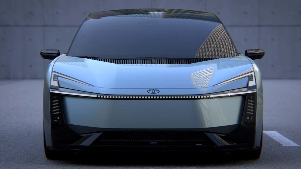 The concept features pixel-style LED daytime running lights, boomerang-shaped DRLs, and vertically stacked LED headlamps framing Toyota’s central logo. The front bumper sports an active air flap for aerodynamic efficiency, while the ducktail rear spoiler, pronounced haunches, and short bonnet give it a sporty, aggressive stance.
